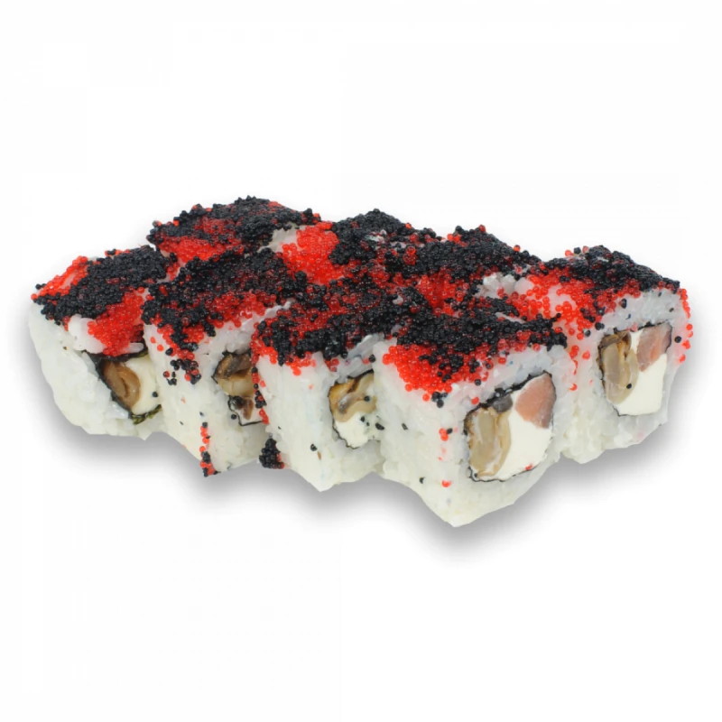Рис, нори, сыр, копченый лосось, грибы, тобико красная и черная.