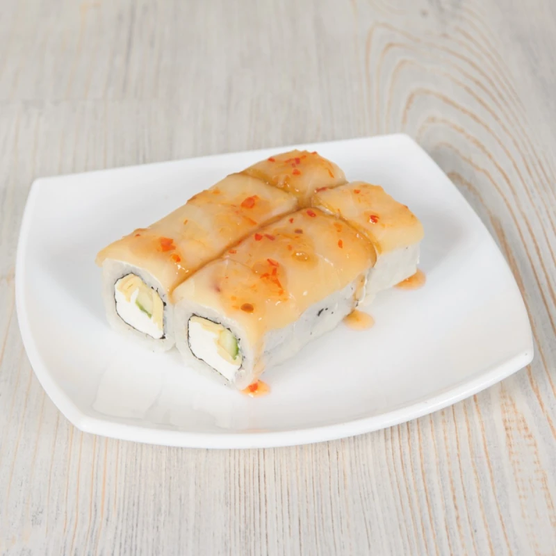 рис, нори, сыр, огурец, омлет, масляная рыба, соус сладкий чили.