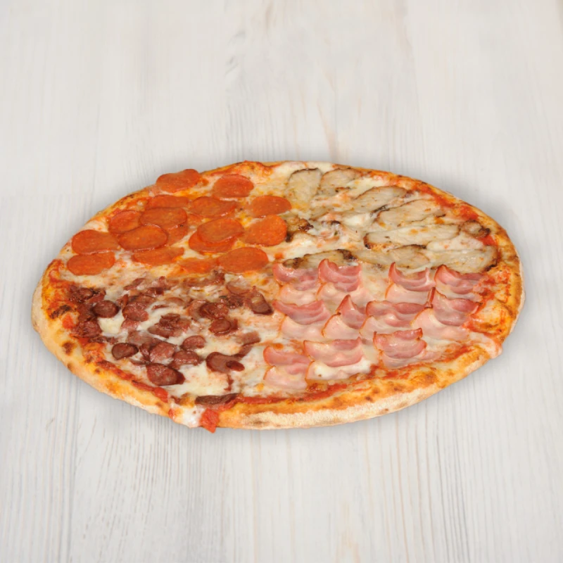 итальянское тесто, Мутти соус, сыр, бекон, пепперони, шашлык, ох.колбаски.