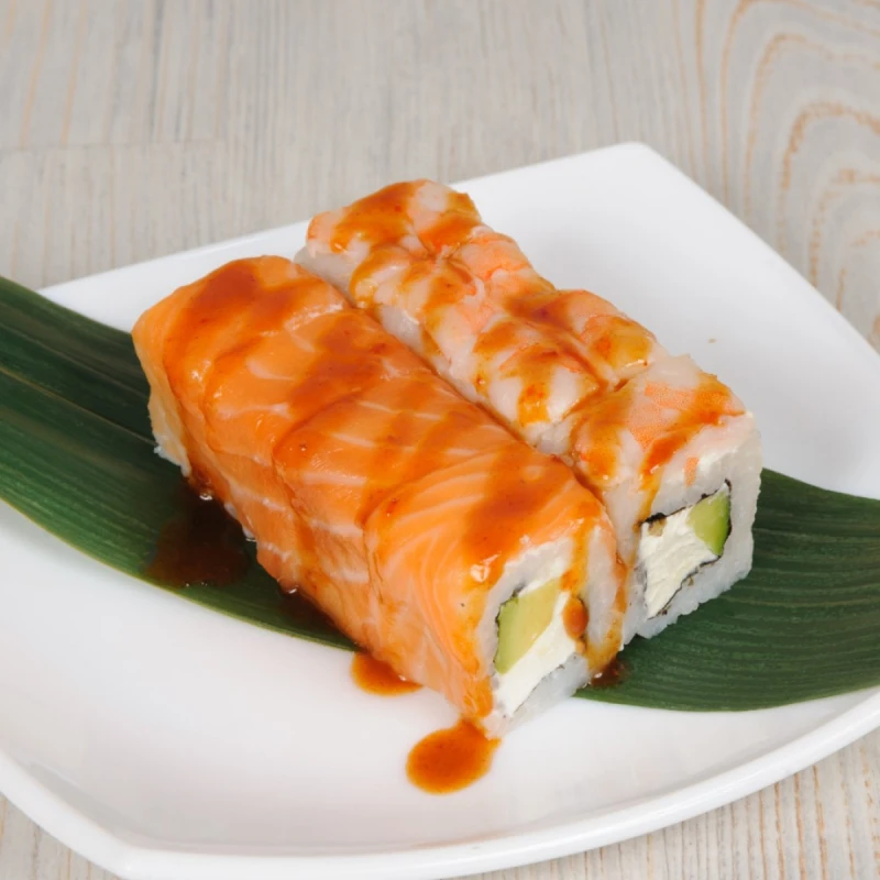 Рис, нори, сыр, авокадо, лосось, креветка, соус лемонграсс.