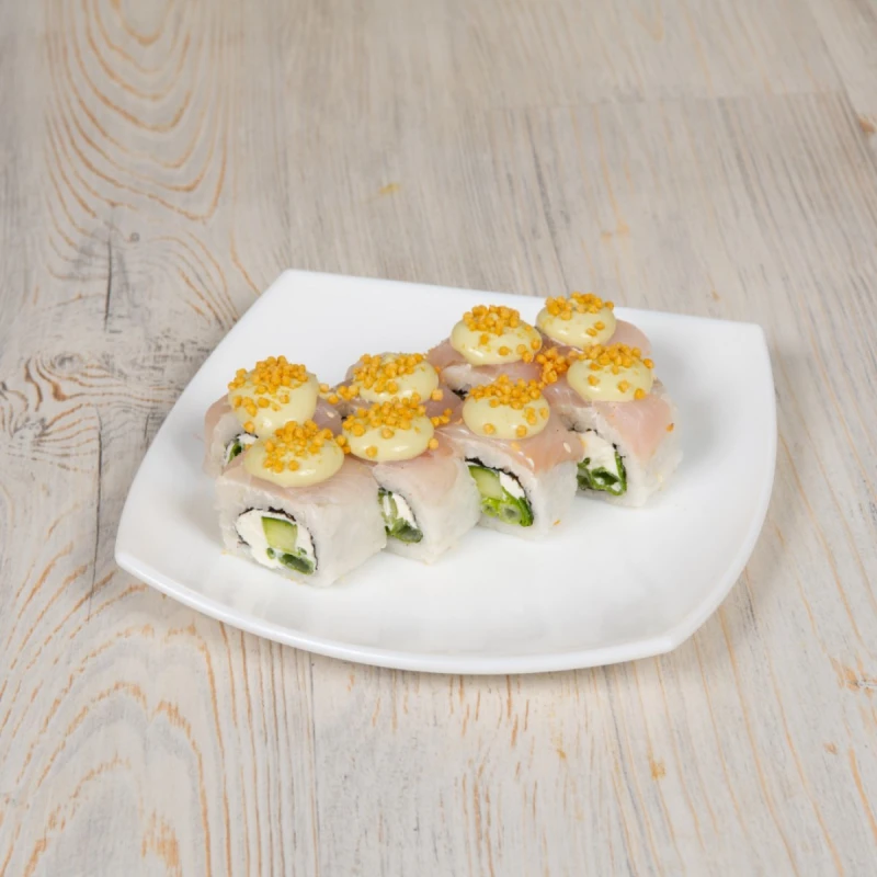 Рис, Нори, сыр Кременте , огурец, зеленый лук, окунь, соус Васабик, рисовые шарики том ям.