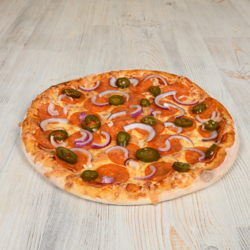 Классическое тесто, мутти соус, моцарелла, пепперони, лук красный, халапеньо, мёд.