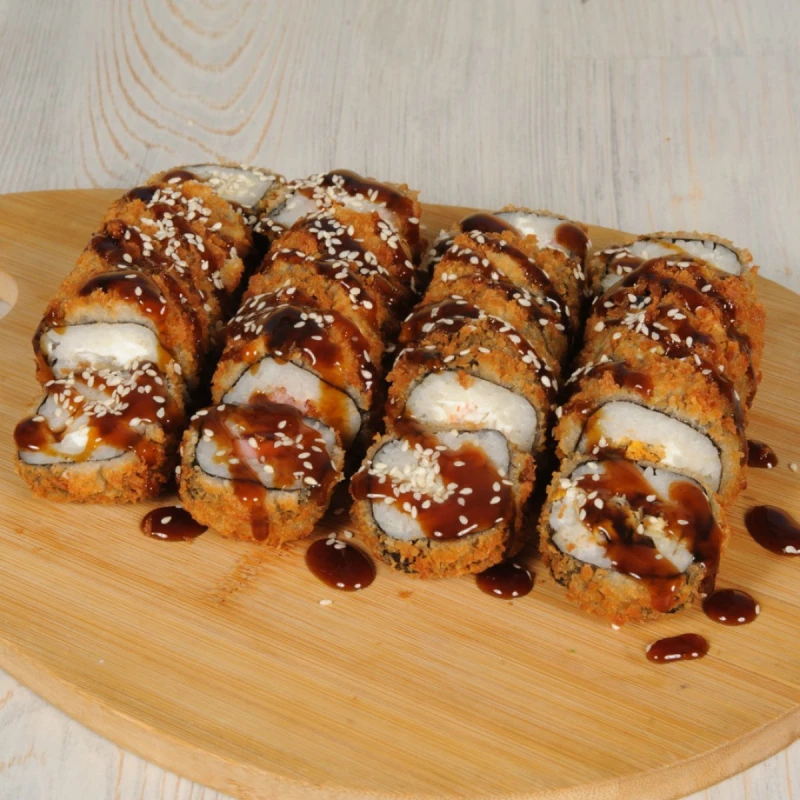Жареные: ролл с сыром и тунцом, ролл с сыром и мидиями, ролл с сыром и окунем, ролл с сыром и снежным крабом, унаги соус, кунжут.